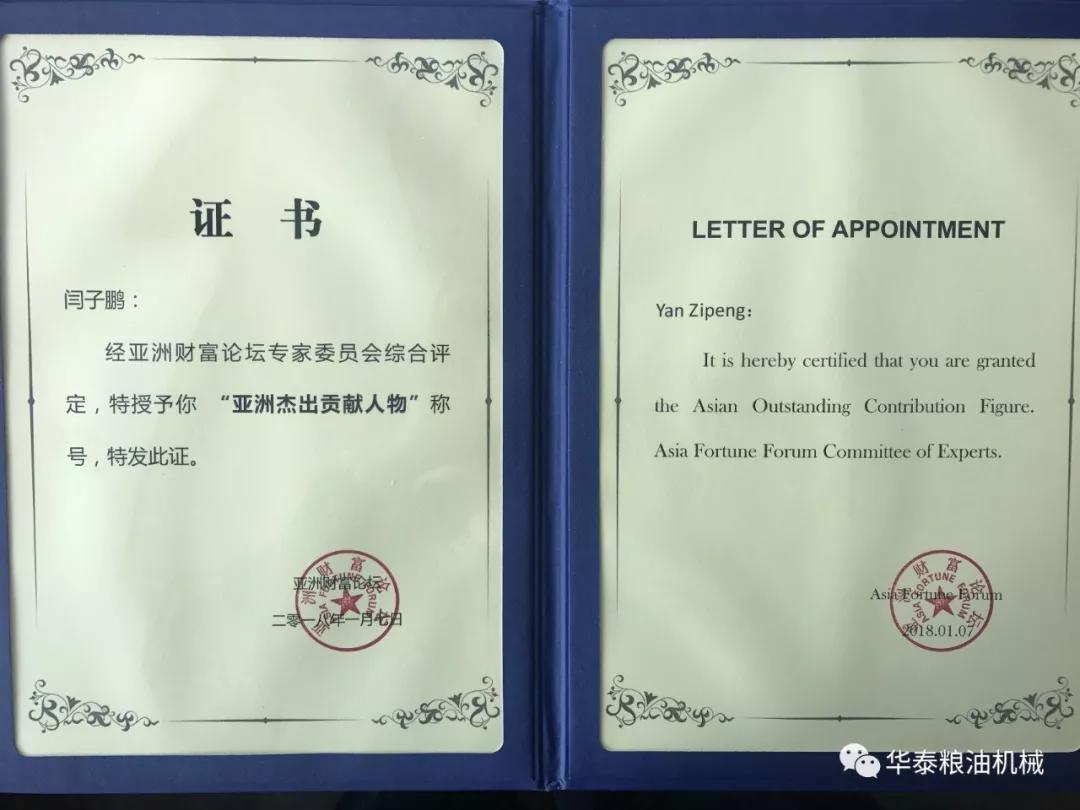 ?日前,從亞洲財富論壇上傳來喜訊:河南華泰糧油機械股份有限公司被評為“亞洲杰出企業”,及董事長閆子鵬被評為“亞洲杰出貢獻人物”。