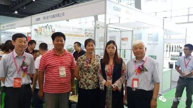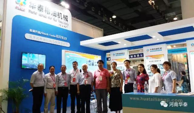 圖為河南省政協委員、中國糧油學會油脂分會副會長、河南華泰糧油機械股份有限公司董事長閆子鵬攜公司國際事業部副總經理張俊利與國家糧食局原副局長現為中國糧油學會理事長張桂鳳、中國糧油學會油脂分會會長王瑞元等領導在華泰機械展位前。